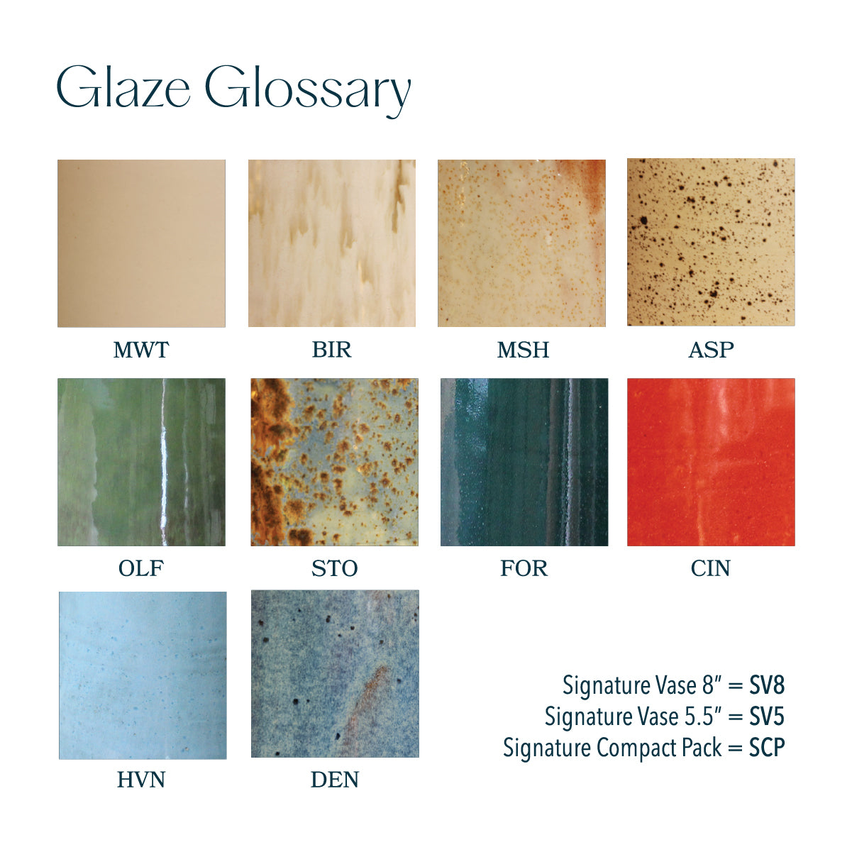 If you order multiple products, you will receive multiple collection kits to accommodate different ashes if needed. To the left is our glaze glossary with three letter codes for each finish and the products. Your collection kits will be labeled with these codes (for example: SV8-STO is our 8" Signature Vase in Storm). Put the desired ashes in the appropriate bags and send them to us, we use this system to ensure the memorials are made exactly to your liking and order information.